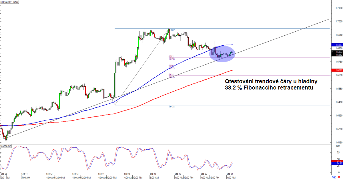 GBP/AUD: Tento měnový pár na 1hodinovém grafu našel support u důležité psychologické hladiny 1,6800, což je u úrovně 38,2 % Fibonacciho retracementu a u rostoucí trendové čáry. Dojde brzy k dalšímu růstu? Stochastic opustil přeprodanou zónu, takže kupci již možná plánují další nákupy. Jestli věříte v růst k předchozím maximům kolem 1,7000, tak long pozice na současné úrovni se zdá být jako dobré obchodní nastavení. Jestli však očekáváte pokles, počkejte si na prolomení supportu. Připravte si dobrý obchodní plán.