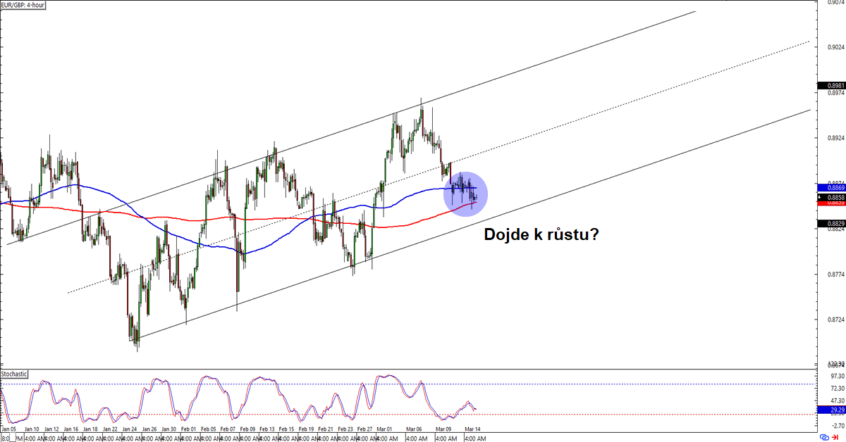 EUR/GBP: Tento měnový pár má na 4hodinovém grafu potíže s prolomením pod hladinu 0,8850, což koresponduje s klouzavými průměry SMA 100 a SMA 200 a je to těsně nad supportem rostoucího trendového kanálu. Stochastic již opustil přeprodanou zónu, takže bude potřeba si počkat na nové býčí momentum. Jestli ale očekáváte pokles, počkejte si na prolomení dolů a pak hledejte short příležitost.