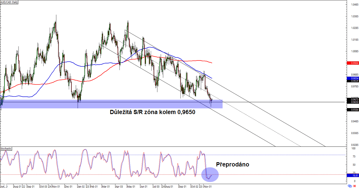 AUD/CAD: Tento měnový pár na denním grafu kolem hladiny 0,9600 vytváří dlouhé spodní stíny svíček. Tato hladina je totiž blízko důležité S/R zóny. Jestli věříte v odraz vzhůru, tak long pozice při náznaku odrazu se zdá být jako dobré obchodní nastavení. Logickým cílem by byla hladina 0,9900, která koresponduje s rezistencí klesajícího trendového kanálu blízko klouzavého průměru SMA 100. Buďte ovšem opatrní, obchodování proti trendu není pro každého.