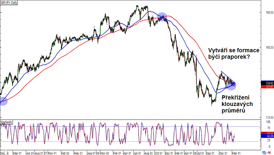 GBP/JPY: Tento měnový pár na denním grafu vytváří formaci býčí praporek. Klouzavý průměr SMA 100 právě překřížil SMA 200 nahoru, což je u tohoto měnového páru důležitý indikátor směru trendu. Případné proražení vzhůru nad býčí praporek by mohlo dostat cenu k důležité oblasti kolem 143,00 nebo dokonce k předchozím maximům okolo 148,00. V případě vstupu do long pozice nechte ovšem dostatek prostoru pro Stop-loss pro případ zvýšené volatility.