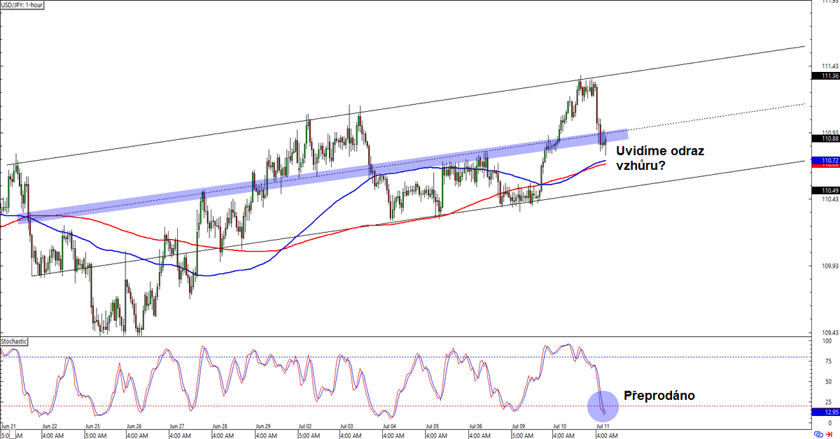 USD/JPY: Tento měnový pár se na 1hodinovém grafu obchoduje v rostoucím trendovém kanálu a aktuálně se nachází kolem jeho středové linie. Indikátor Stochastic se již zároveň nachází v přeprodané oblasti, což značí možnou vyčerpanost medvědů. Uvidíme tak odražení tohoto měnového páru zpět směrem k rezistenci trendového kanálu?
