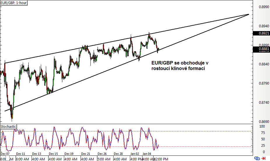 EUR/GBP: Tento měnový pár se na 1hodinovém grafu obchoduje v rostoucí klínové formaci a aktuálně testuje její support. Indikátor Stochastic současně opouští přeprodanou oblast. Uvidíme tak odražení vzhůru zpět směrem k rezistenci klínové formace?