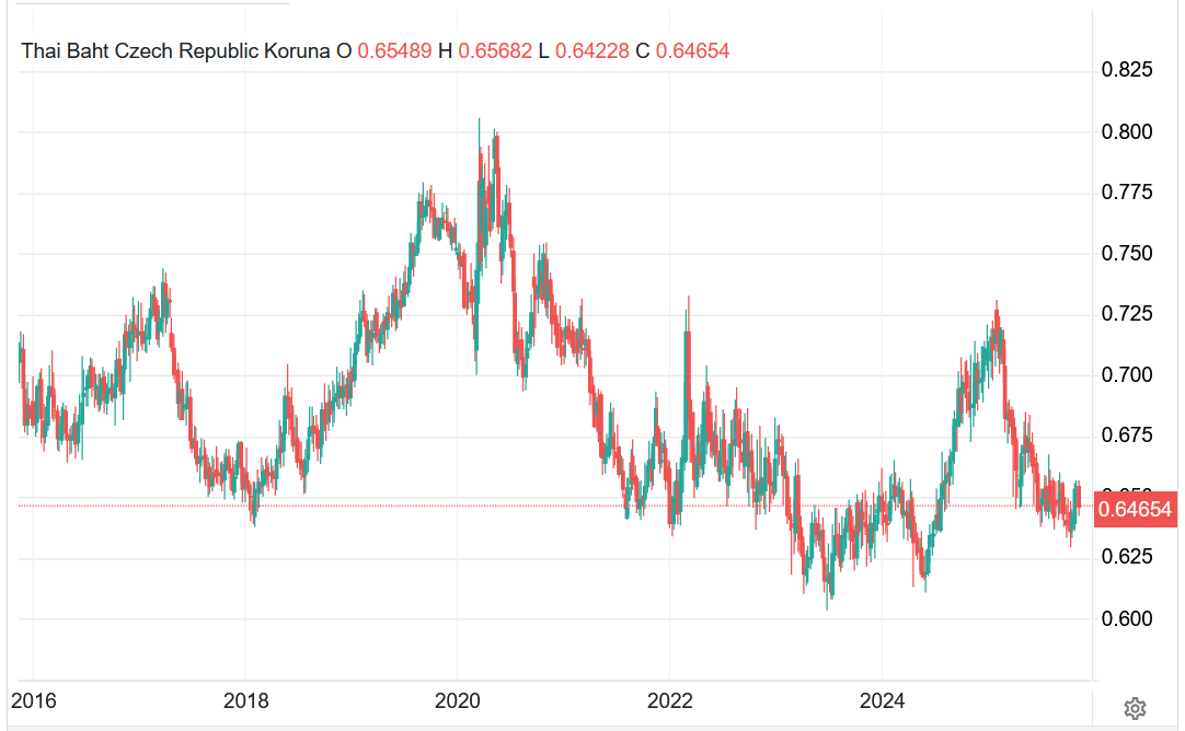 Vývoj kurzu thajského platidla vůči české koruně – THB/CZK (týdenní časový rámec):