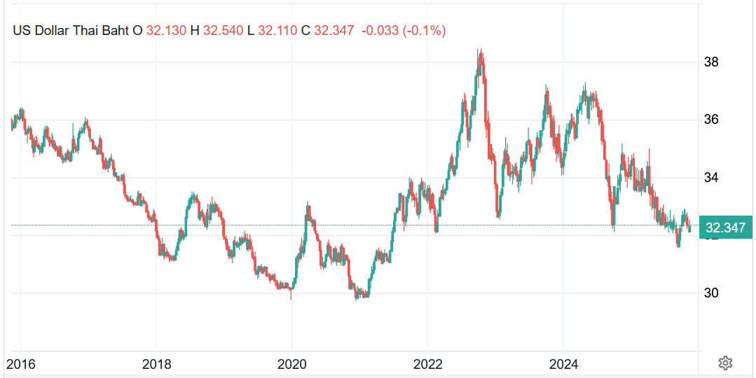 Vývoj kurzu amerického dolaru vůči thajskému platidlu – USD/THB (týdenní časový rámec):