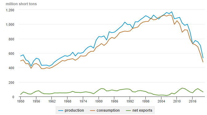 Vývoj produkce, spotřeby a čistých exportů uhlí v USA, v mil. tun: