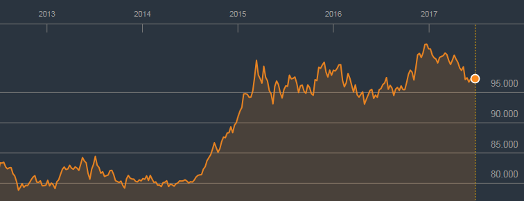 Vývoj amerického dolarového indexu za posledních 5 let: