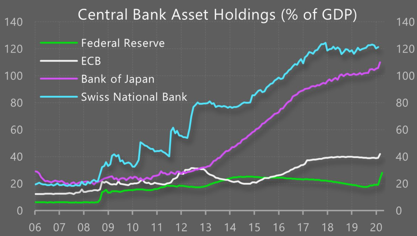 Skutečně Švýcarsko i Japonsko se „pyšní“ největším objemem aktiv k HDP mezi centrálními bankami, viz graf (ČNB s 65 % HDP také není pozadu). Vydávání stále nových franků a jenů ve stovkách miliard nebrání tomu, aby je investoři dále kupovali a obě měny si udržely svou hodnotu.