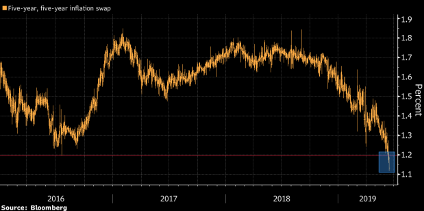 Není se tedy co divit, že trhy přestaly věřit, že se inflace v dlouhodobém horizontu podaří dostat na cíl lehce pod 2 %. Jak je vidět z grafu, od podzimu 2018 se 5letá inflační očekávání propadla z 1,7 % až téměř na 1,1 %. Finanční (či lépe řečeno dluhopisové) trhy tedy čekají naplnění japonského scénáře s dlouhodobě zápornými sazbami a minimální inflací. Mimochodem výnos 10letého německého dluhopisu dále klesá a dosahuje již -0,26 % p.a.