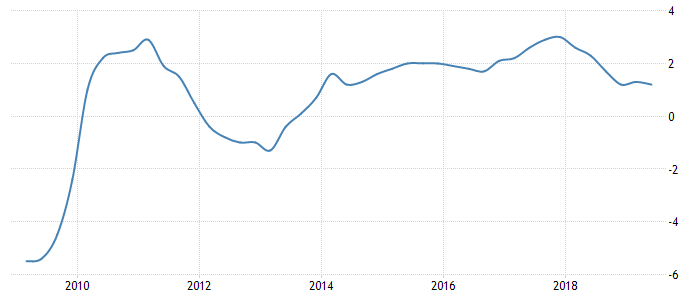 Nyní to ale vypadá, že americko-čínský celní ping-pong ustává a rýsuje se jakýsi první draft obchodní dohody. Ani brexit už není tak velkým strašákem pro finanční trhy, byť zřejmě dojde k dalšímu prodloužení. A především pak všechny chmurné předpovědi o blížící se globální recesi se příliš nenaplňují. Zpomalení je sice vidět napříč světem s mělkou recesí v Itálii, Německu a Japonsku, není to ale žádná katastrofická černá labuť plná bankrotů a masového propouštění. Z grafu můžete vidět porovnání globální krize, recese let 2012-13 a aktuálního zpomalení HDP v eurozóně.