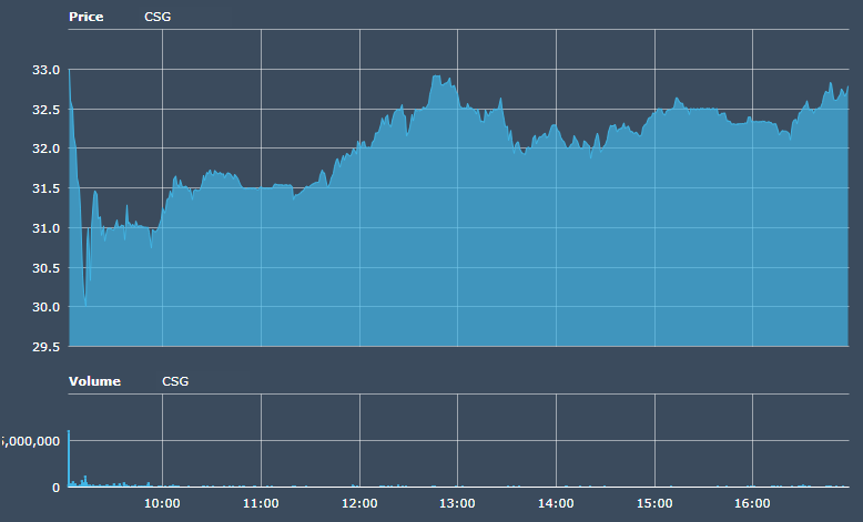 Vývoj ceny akcie CSG v první den obchodování 23.1.2026: