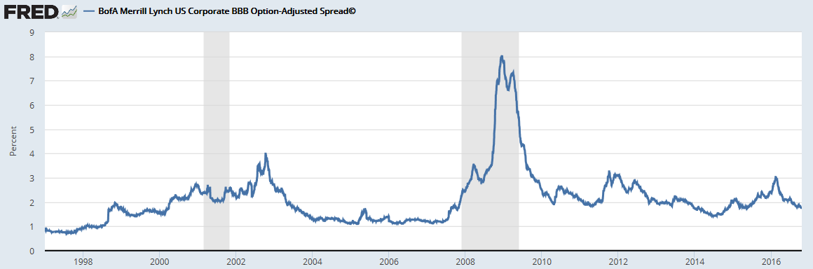 Např. na počátku letošního roku kvůli nízkým cenám ropy investoři houfně prodávali dluhopisy amerických těžařů a vyhnali spread celého BBB trhu až k 3 %, následně se ale situace s růstem cen ropy uklidnila. I přes aktuálně nízké spready ale můžeme konstatovat, že na konci 90. let i v letech 2004-08 byly rizikové prémie ještě níže. Pokud je tedy dnes na korporátních dluhopisech bublina, byla zde také po většinu předkrizového období.