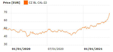 Jaký mají dopad předražené povolenky na hospodaření a cenu akcií ČEZ? I přes provozování několika uhelných elektráren českou polostátní energetikou je netto dopad veskrze pozitivní. Cena elektřiny v Evropě totiž zdražuje ruku v ruce s cenou povolenek (viz graf), jen za posledních 6 měsíců zdražila ze 46 na 71 EUR za MWh. A ČEZ se v posledních 2 letech zbavil prodejem nebo uzavřením několika uhelných aktiv a jádrem jeho businessu zůstává bezemisní jádro plus nezanedbatelnou část tvoří vodní elektrárny a biomasa.