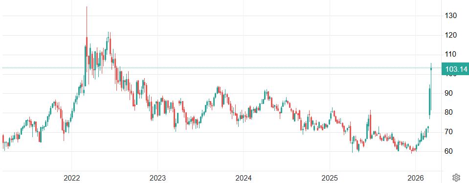 Jsme nyní svědky historicky největšího výpadku dodávek ropy. Zhruba 15 milionu barelů denně (mbd) se nemůže dostat z Perského zálivu ke spotřebitelům a tato ztráta zatím katapultovala ceny ropy ze 70 na 100 USD za barel. Inflační očekávání rostou, vzpomínka na rok 2022 a nedostatek energií, průmyslových materiálu i potravin a dvojciferný růst cen mají tradeři v živé paměti.