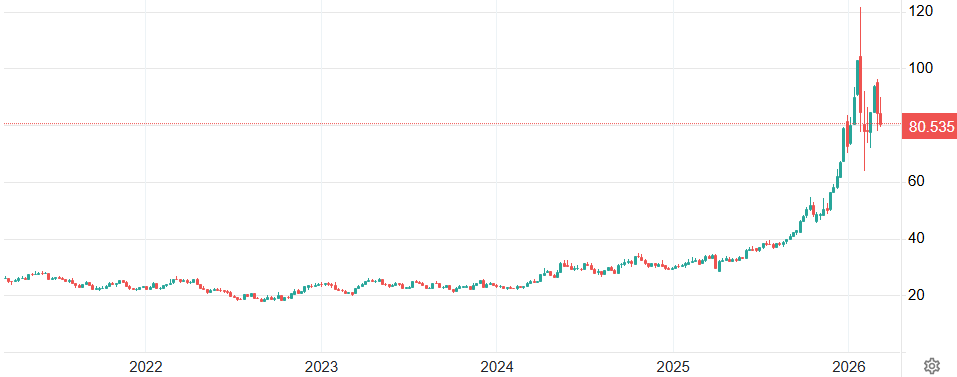 Vývoj ceny ropy Brent v USD za barel (týdenní graf – W1):