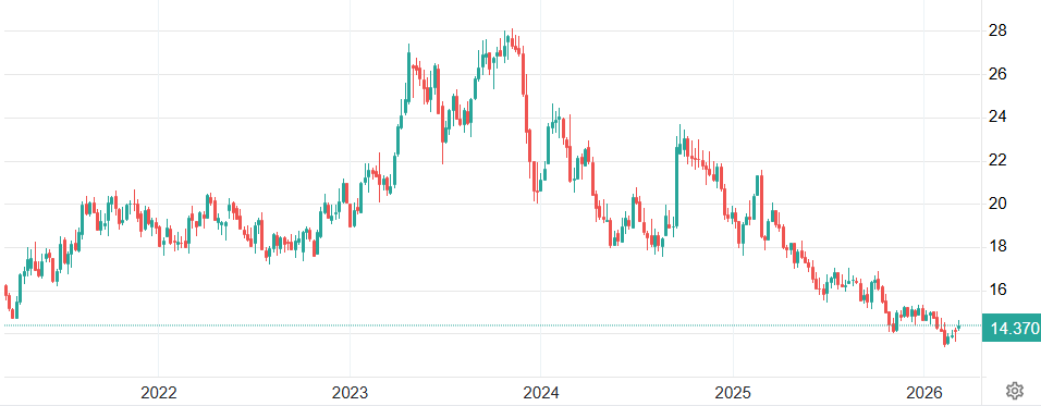 Vývoj ceny stříbra v USD za unci (týdenní graf – W1):