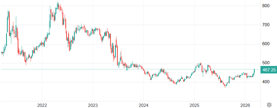 Vývoj ceny kukuřice v USD za bušl (týdenní graf – W1):