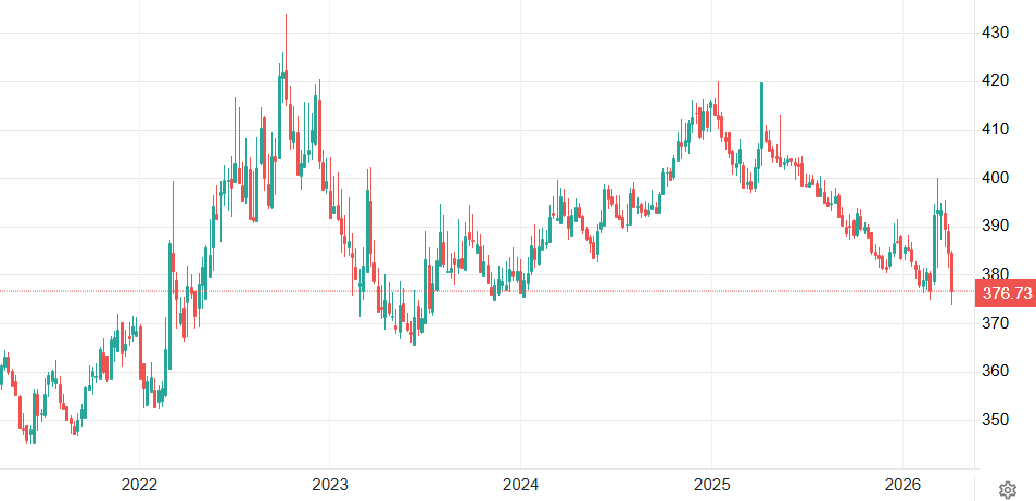 Vývoj měnového páru EUR/HUF (týdenní graf – W1):