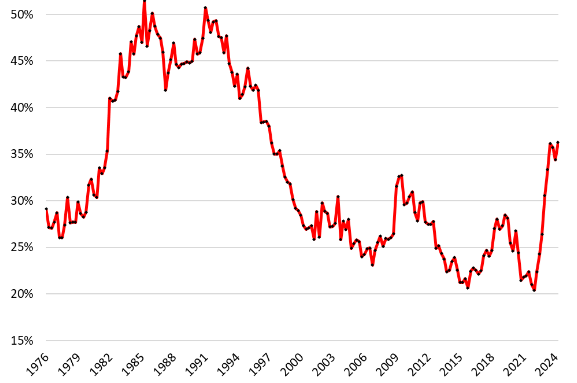 Mezitím prudce rostou úrokové náklady nejen kvůli samotnému zvyšování dluhu, ale také kvůli restriktivní měnové politice americké centrální banky (Fed). Aktuálně vydává vláda ve Washingtonu 37 % všech svých daňových příjmů jen na úhradu úroků (viz graf). Pro srovnání české vládě stačí na úhradu úroků z dluhů 5 % svých daňových příjmů.