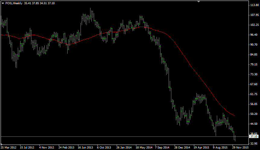 Vývoj cen ropy WTI (týdenní graf – W1):