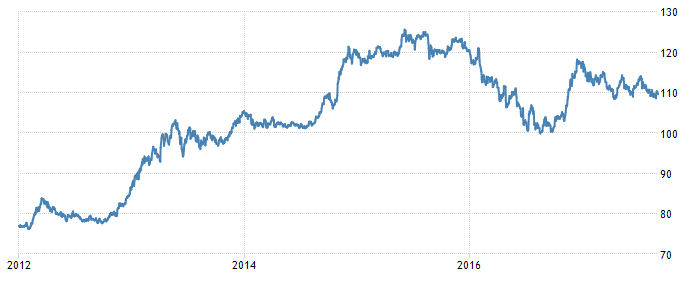 Vývoj měnového páru USD/JPY za posledních 5 let: