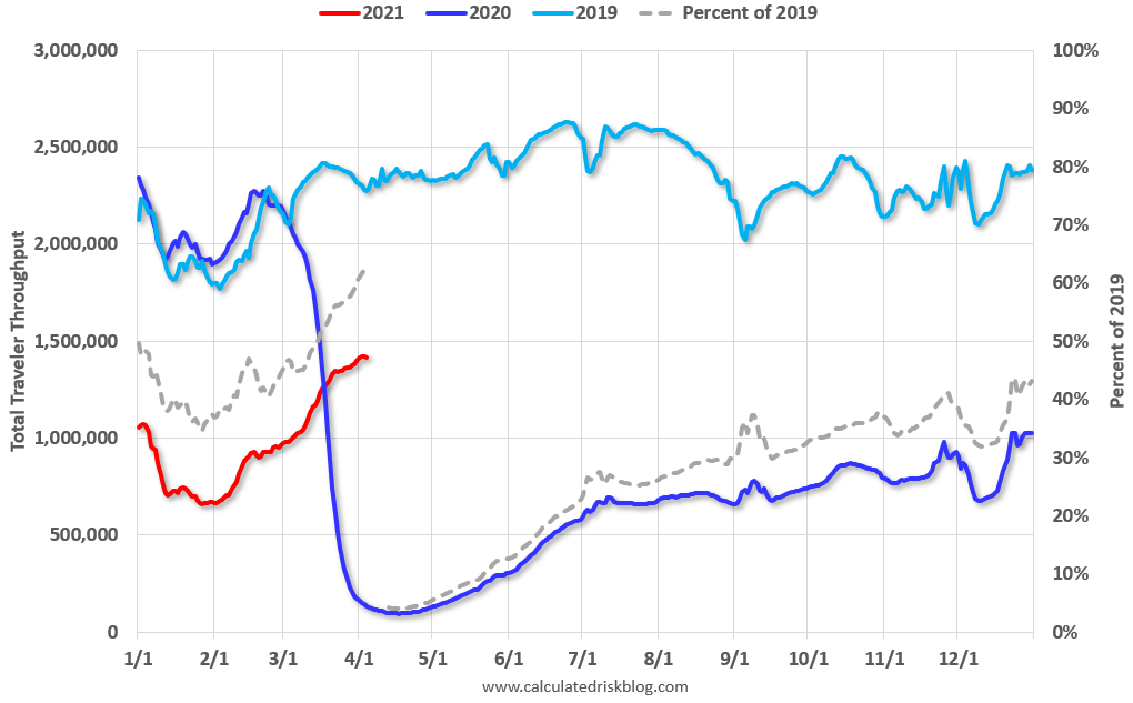 Pro investory s vyšší mírou tolerance rizika jsou připravené i akcie amerických aerolinek. Počet pasažérů na amerických letištích totiž prudce roste a dostává se již na 60 % normálu roku 2019 (viz graf). S postupující vakcinací, plnými peněženkami domácností i touhou znovu vycestovat by se tato čísla měla dostat velice rychle zpět ke 100 % normálu.