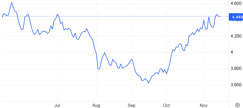 Fed byl připraven postupně snižovat úrokové sazby z nynějších 4,50 – 4,75 %, ale šance na další uvolnění měnových kohoutů z důvodů uvedených výše postupně slábne. Tradeři aktuálně vidí pouze 62 % pravděpodobnost na další pokles sazeb v prosinci, přičemž dříve se debata točila jen kolem snížení o 25 nebo 50 bazických bodů.