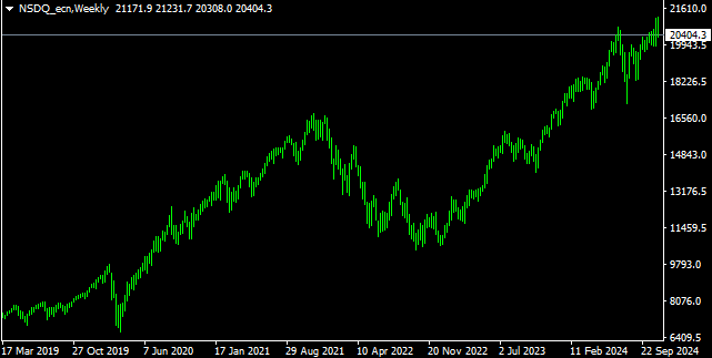Vývoj akciového indexu Nasdaq (týdenní graf – W1):