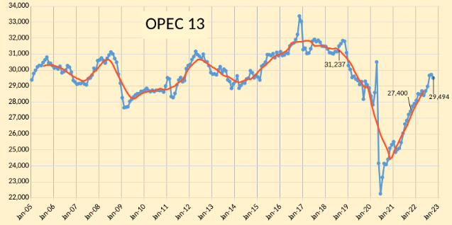 Vývoj produkce kartelu OPEC (v tis. barelů denně):