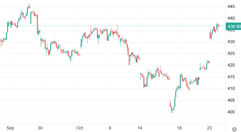 Vývoj ceny akcií BP (hodinový graf – H1):