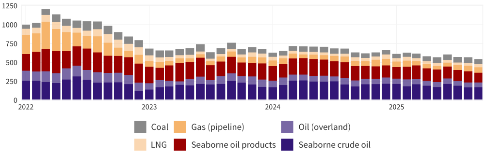 Vývoj hodnoty ruských vývozů energií (v mil. EUR denně):