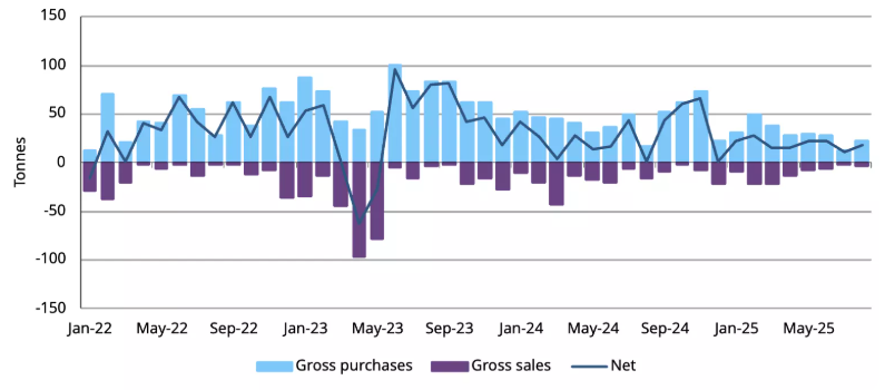 Vývoj čistých nákupů zlata do rezerv centrálních bank globálně (měsíčně, v tunách):