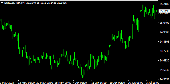 Vývoj měnového páru EUR/CZK (4hodinový graf – H4):