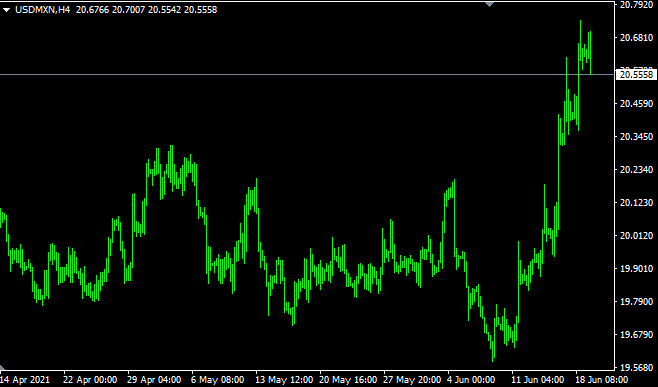 Vývoj měnového páru USD/MXN (4hodinový graf – H4):