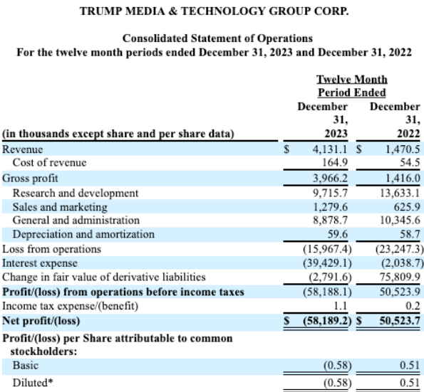 Výsledovka společnosti TMTG za roky 2023 a 2022 (před fúzí s DWAC):