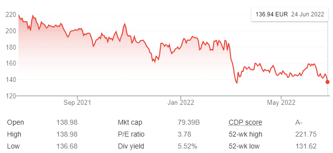 Vývoj ceny preferenční akcie Volkswagen za posledních 12 měsíců: