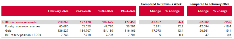 Centrální banka v Ankaře se snaží držet kurz liry relativně stabilní s postupným oslabováním vůči americkému dolaru (viz graf), aby snižovala inflaci. Růst cen v Turecku dosáhl v únoru meziročních 31,5 %, což je na místní poměry úspěch. Kvůli fixu USD/TRY ale musí Turecko prodávat své devizové rezervy, které jen v prvních dvou týdnech války klesly z 66 na 48 mld. USD (viz tabulka).