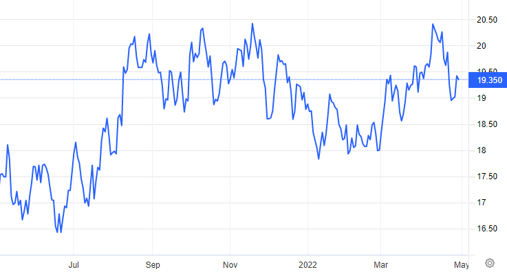 Vývoj ceny cukru za poslední rok, v USD za váhovou libru: