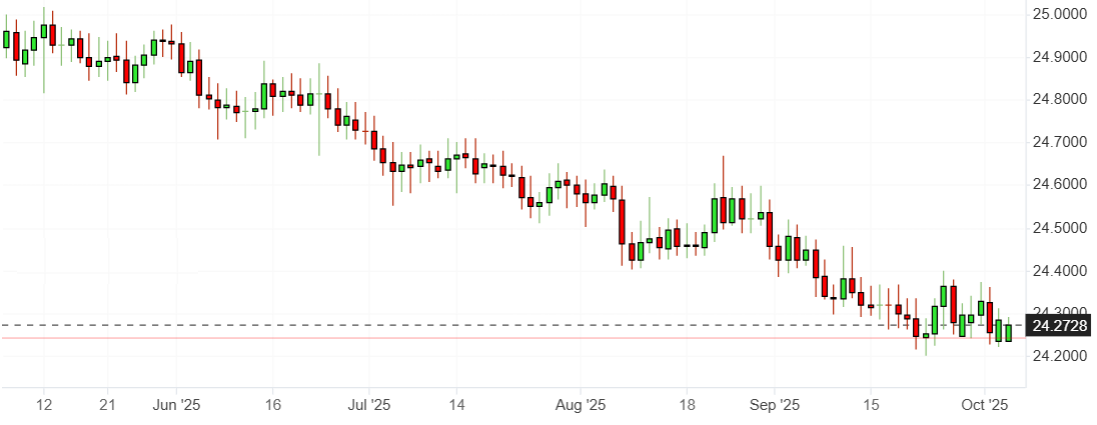 Vývoj měnového páru EUR/CZK (denní graf – D1):