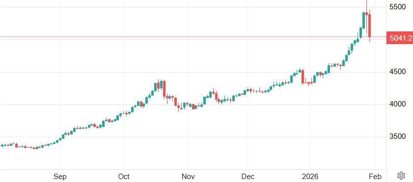 Zlato zůstává silně korelované se stříbrem, akorát jeho pohyby jsou zhruba poloviční nahoru i dolů. Hloubka trhu a přítomnost méně zbrklých investorů typu centrálních bank drží zlato ještě relativně na uzdě. I přesto se nedá říci, že by cena přes 5000 USD za unci byla vhodná jako dlouhodobá investice k nákupu.