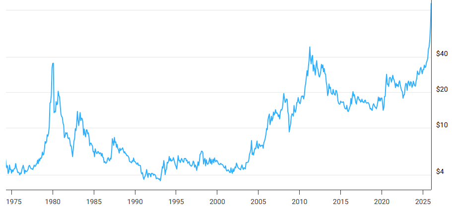 Historický vývoj ceny stříbra v USD za unci (logaritmické měřítko):