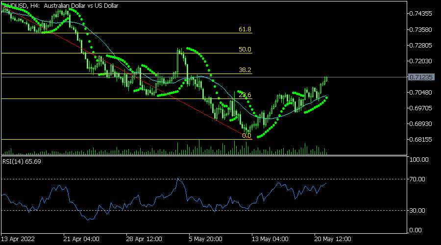 AUD/USD: Na 4hodinovém grafu cena stoupla po volbách v Austrálii. Dostali jsme se až na 0,7121, což je nejvyšší hladina od 10. května. Jsme nad indikátorem Parabolic SAR. Indikátor RSI je skoro v překoupené zóně. Cena je u hladiny 38,2 % Fibonacciho retracementu. Nyní bychom mohli dále růst.