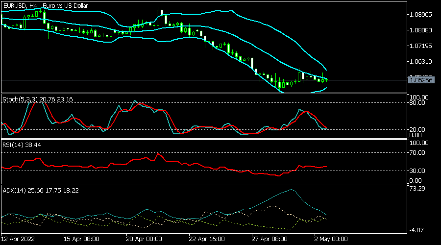 EUR/USD: Na 4hodinovém grafu je cena bez velkých změn díky čekání na zasedání Fedu. Jsme na 1,0528, což je mírně nad letošním minimem 1,0475. Linie Bollingerových pásem se přibližují k sobě, což značí nižší volatilitu. Indikátor Stochastic je přeprodaný. Indikátor ADX klesá. Nyní bychom mohli dále klesat.