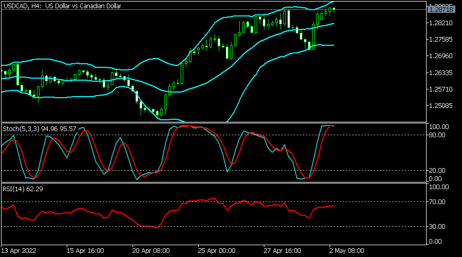 USD/CAD: Na 4hodinovém grafu cena stoupla na 1,2870, což je nejvyšší hladina od minulého týdne. Jsme mezi středovou a horní linií Bollingerových pásem. Indikátor Stochastic je překoupený. Vytvořil se dvojitý vrchol, což značí možné oslabení.