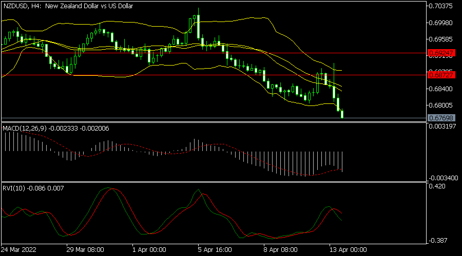 NZD/USD: Na 4hodinovém grafu cena dále klesá a dostali jsme se na nejnižší hladinu od 16. března. Jsme u spodní linie Bollingerových pásem. Indikátor MACD je pod neutrální linií. Jsme pod denním SMA 25. Indikátor RVI zaznamenal medvědí překřížení. Nyní bychom mohli dále klesat.