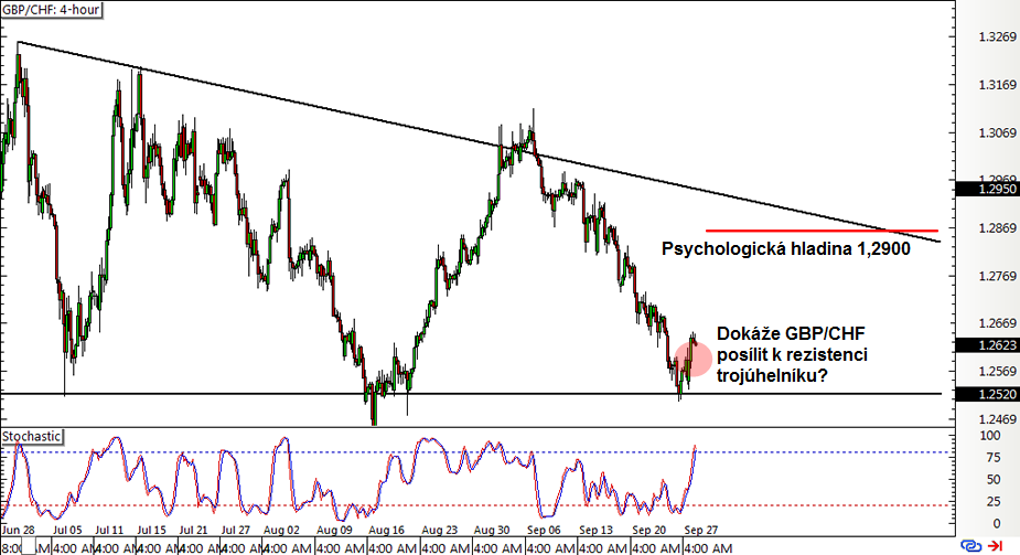 GBP/CHF: Měnový pár GBP/CHF se obchoduje uvnitř trojúhelníkové formace na 4hodinovém grafu. Po otestování supportu trojúhelníku kolem hladiny 1,2500 by mohl měnový pár růst a otestovat naopak rezistenci trojúhelníku kolem psychologické hladiny 1,2900. Dočkáme se růstu měnového páru nebo naopak dojde k průrazu pod support trojúhelníku a následnému poklesu?