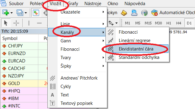 Pro zakreslení trendového kanálu v obchodní platformě můžete využít funkci trendových čar:
