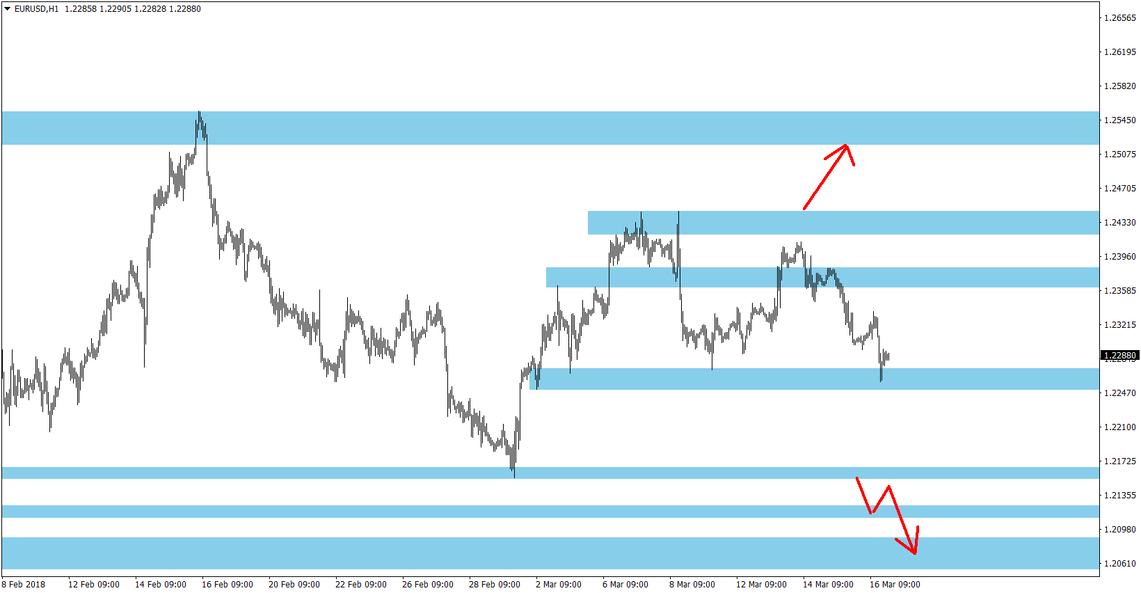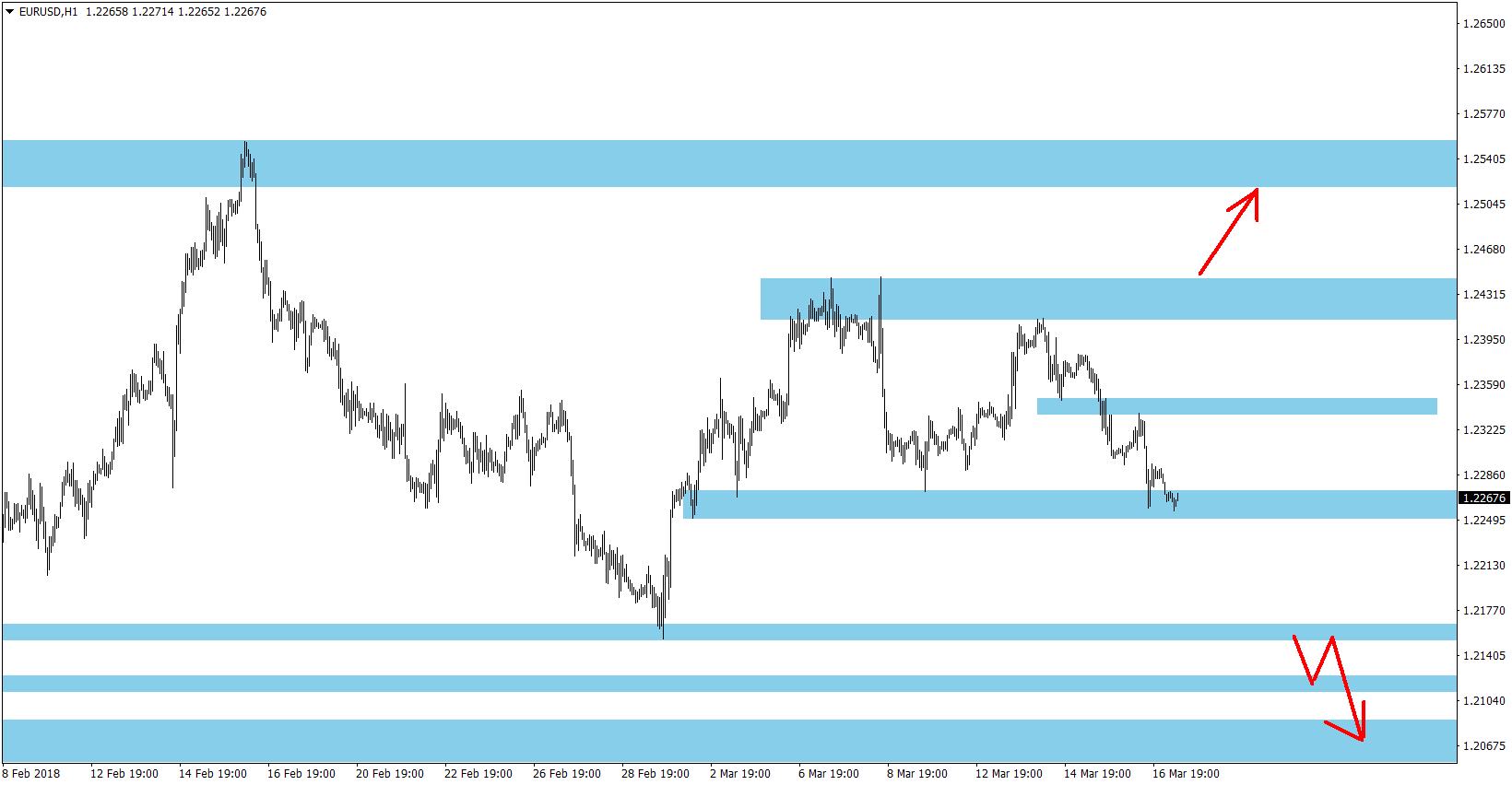Níže na grafu opět najdete mé aktuální Price Action S/R úrovně pro H1 timeframe a také obchodní nastavení - vyznačené šipky, k jakým S/R zónám by trh mohl směřovat (po jejich prolomení).