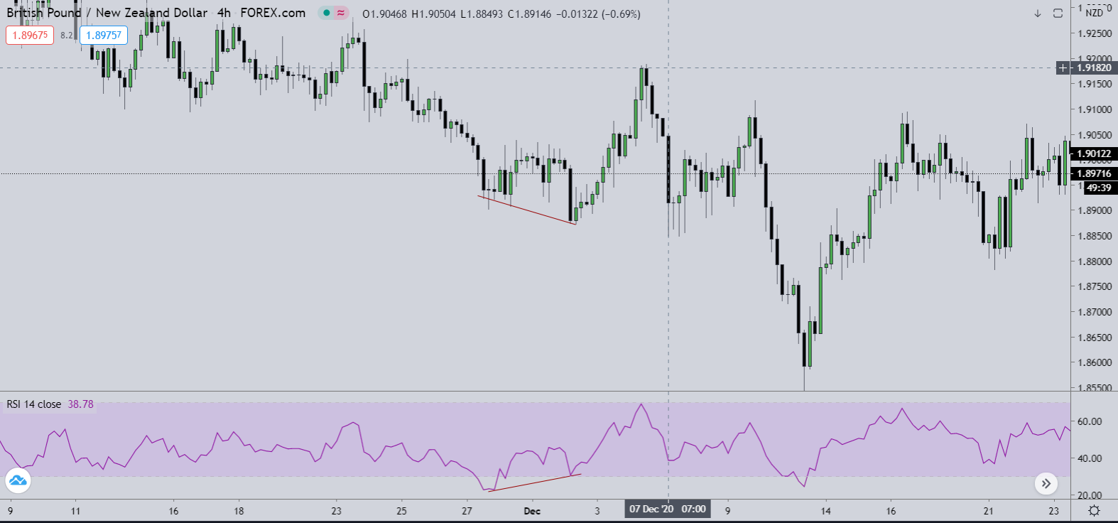 Dále můžete i zkusit obchodovat divergence. Na grafu můžeme vidět, že dochází k býčí divergenci. Měnový pár GBD/NZD začal tvořit nižší low, zatímco indikátor RSI vyšší low. Navíc se indikátor pohyboval pod hladinou 70, což značí silný signál pro nákup tohoto instrumentu.