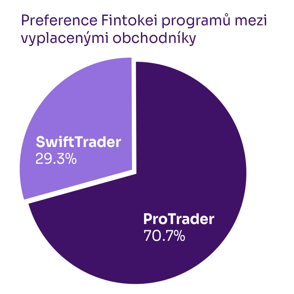 Další poznatek, který vyplývá z našich dat ohledně payoutů, se týká oblíbenosti námi nabízených programů. Je totiž zřejmé, že mezi vyplacenými obchodníky je nejoblíbenější program ProTrader. Ten patří mezi standardní prop tradingové programy s dvoufázovou evaluační výzvou. Naopak program SwiftTrader, který umožňuje obchodovat s virtuálním kapitálem hned od prvního dne a bez výzvy, mezi tradery tolik neletí.