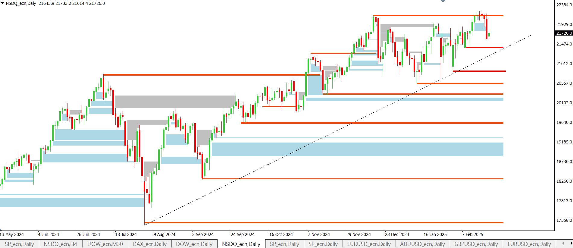 Například na indexu Dow Jones se nepodařilo překonat předchozí high, ale došlo pouze k jeho retestu 31. 1. 2025 a dále pak 6. 2. Takže máme rovnocenné high. Cena se pak pohybovala pod tímto vrcholem. Páteční pokles vedl k proražení menšího supportu, který byl na 43 821 USD. Ten je nyní nejbližší rezistencí.